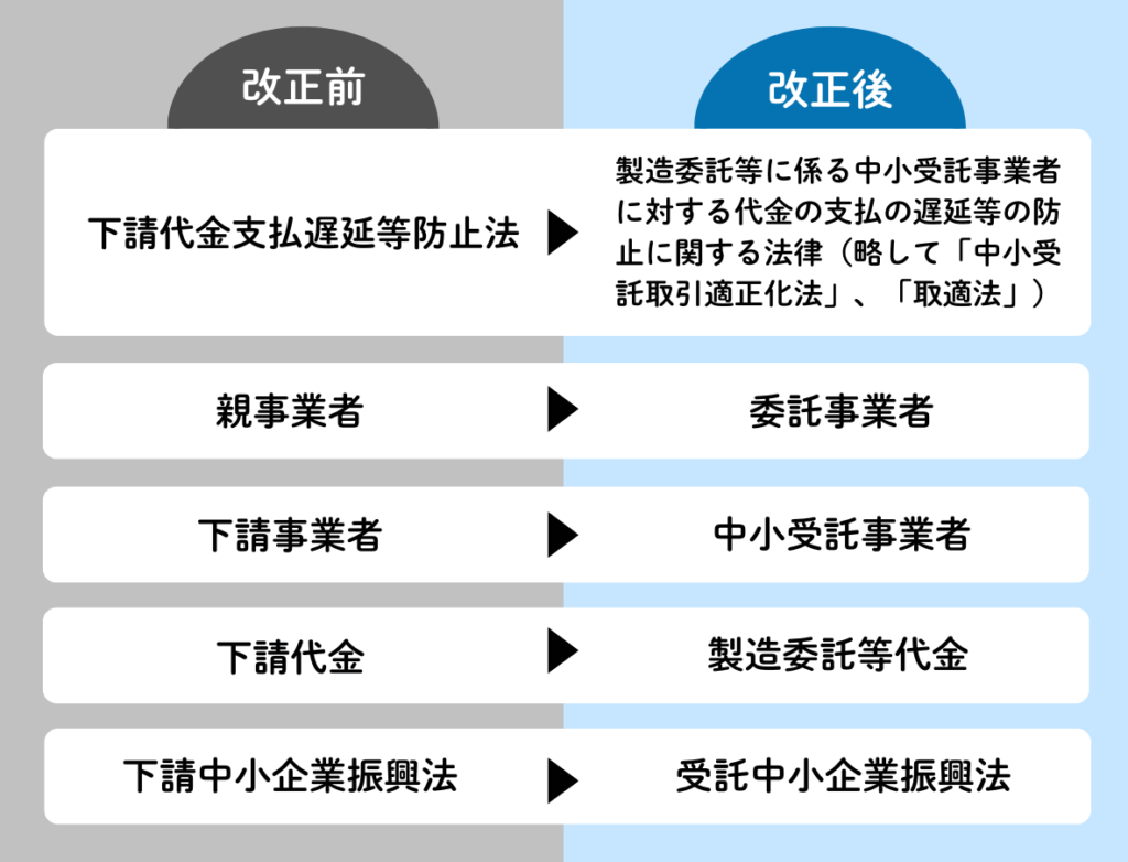 こうした流れを踏まえ、従来「下請法」として知られてきた下請代金支払遅延等防止法が、令和7年5月16日に改正され、令和8年1月1日から「製造委託等に係る中小受託事業者に対する代金の支払の遅延等の防止に関する法律」(略して「中小受託取引適正化法」、「取適法」)として施行されます。