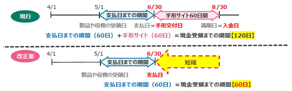 改正法では、納品または役務提供の完了日から60日以内に、手数料などを差し引かれることなく全額現金化できる支払いを義務づけています。
