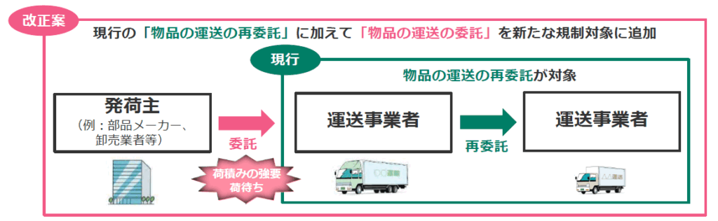 従来は「再委託」のみが対象でしたが、部品メーカーや卸売業者などの荷主が運送事業者に「直接」委託する取引も、新たに「特定運送委託」として規制対象に加わりました。これは、物流業界で長年問題とされてきた長時間待機や無償作業などの是正を目的としています。